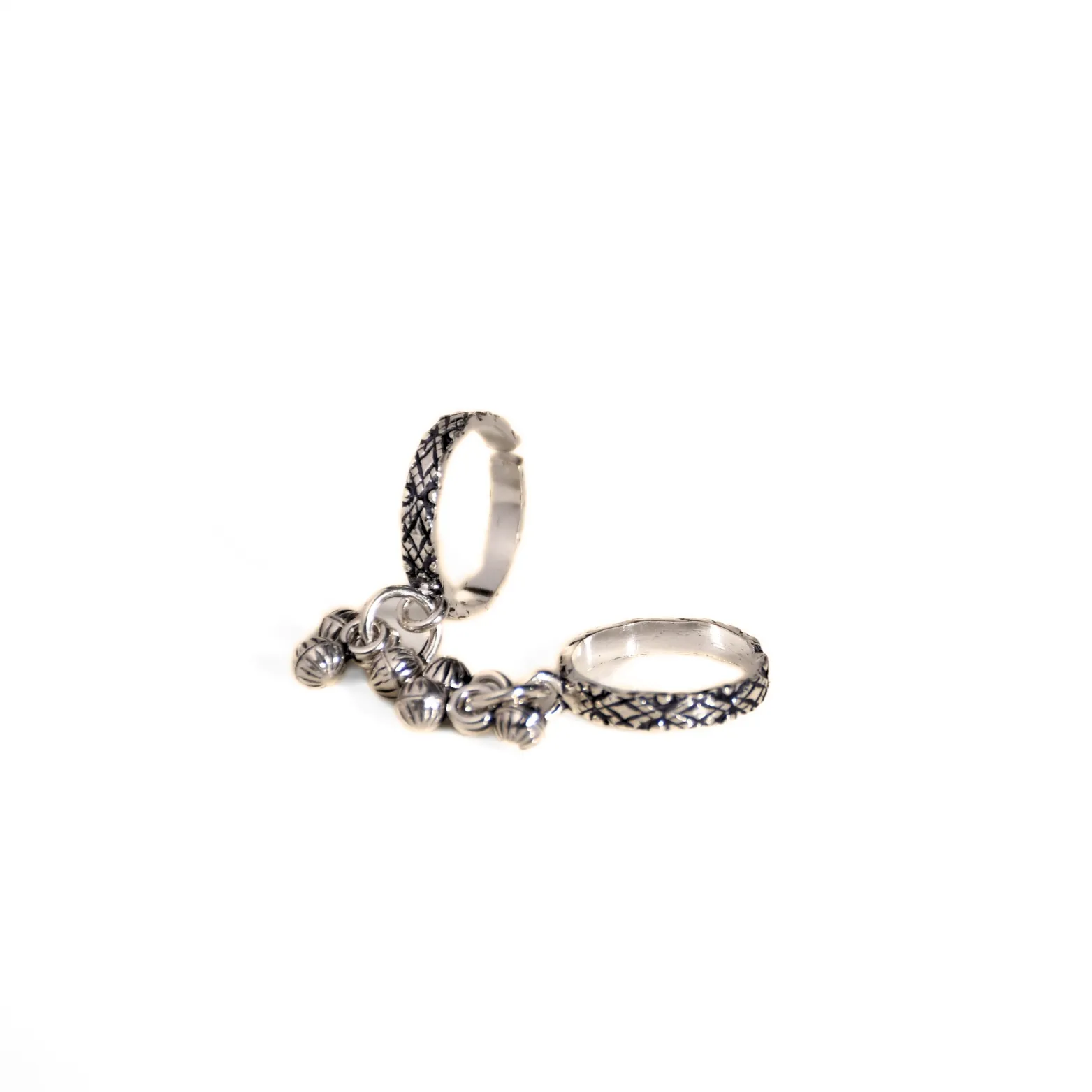 Elevate your ethnic style with these stunning Vintage Jhumki Silver Toe Rings. Crafted from pure 92.5 sterling silver, these oxidized toe rings feature intricate engraving along the band and mini dangling jhumkis that add a playful, traditional touch. Perfect for daily wear or festive occasions, this pair blends heritage charm with durability for a timeless accessory.